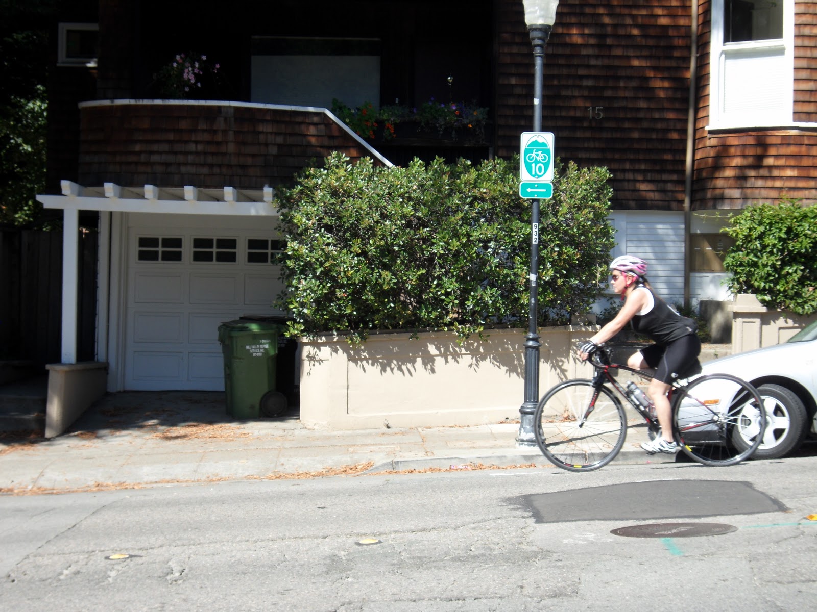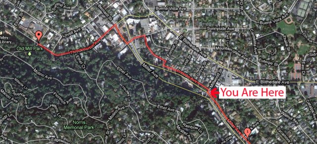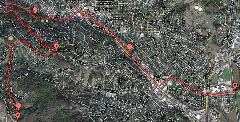Follow Sunnyside Avenue through the center of Mill Valley. Look at the map above and just remember to follow the Route 10 signs if the turns in this part of the route get a bit confusing. The twists and turns in this section are to keep you off Miller Avenue where it has high-speed traffic and no shoulder. Once you arrive at the stop sign with Miller Avenue, this signals the end of Route 10. The rest of journey to Panoramic Highway you’ll have to watch for the street names as this next part of the journey is not part of a marked bike route.