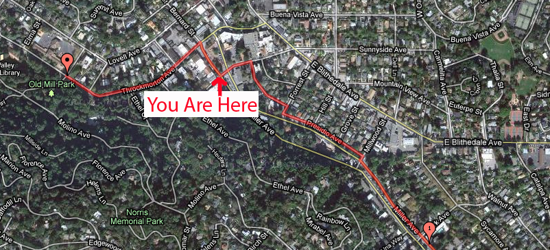Follow Miller Avenue until you approach the Mill Valley Cabinet Shop on your left. Here, you’ll make a quick right onto Millwood Street and then an immediate left onto Presidio Avenue.