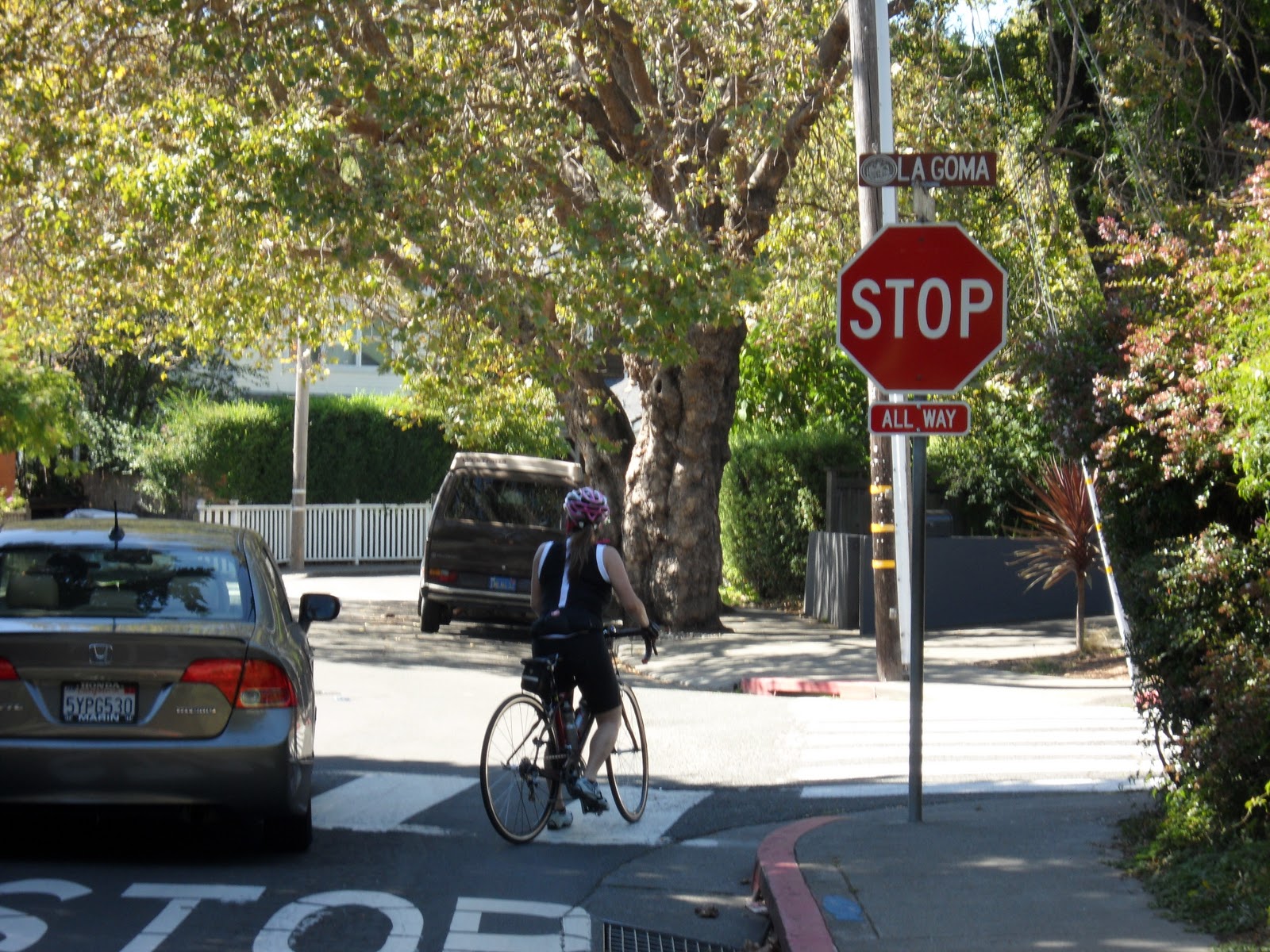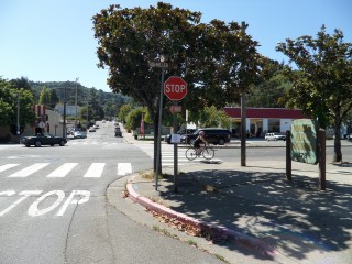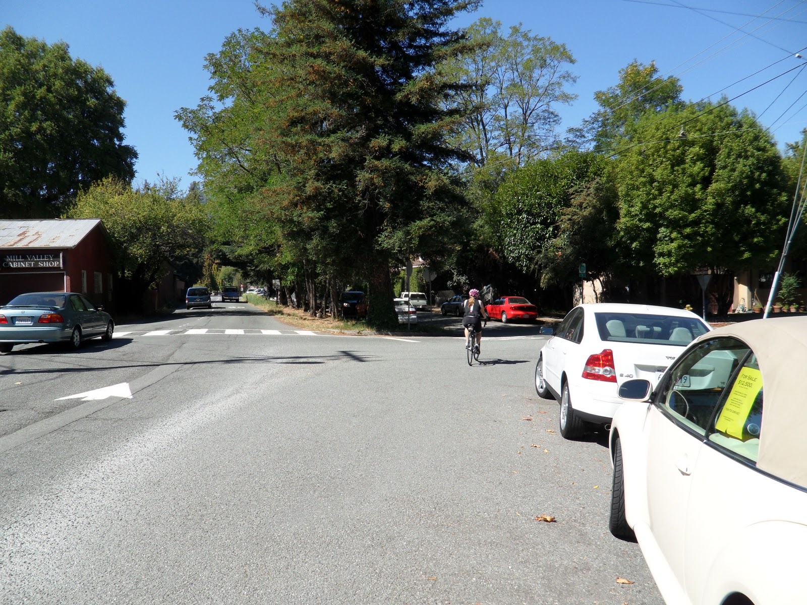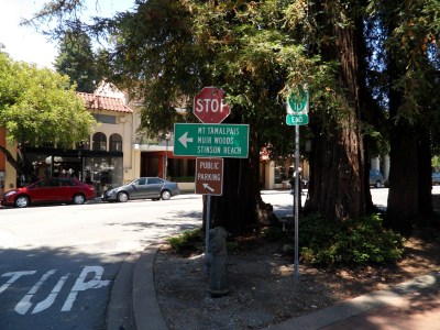 The green sign (pictured above), below the stop sign at Miller Avenue, indicates “Mt Tamalpais, Muir Woods and Stinson Beach” to the left, these are directions for cars, not cyclists. Instead, you will make a right on to Miller Avenue.