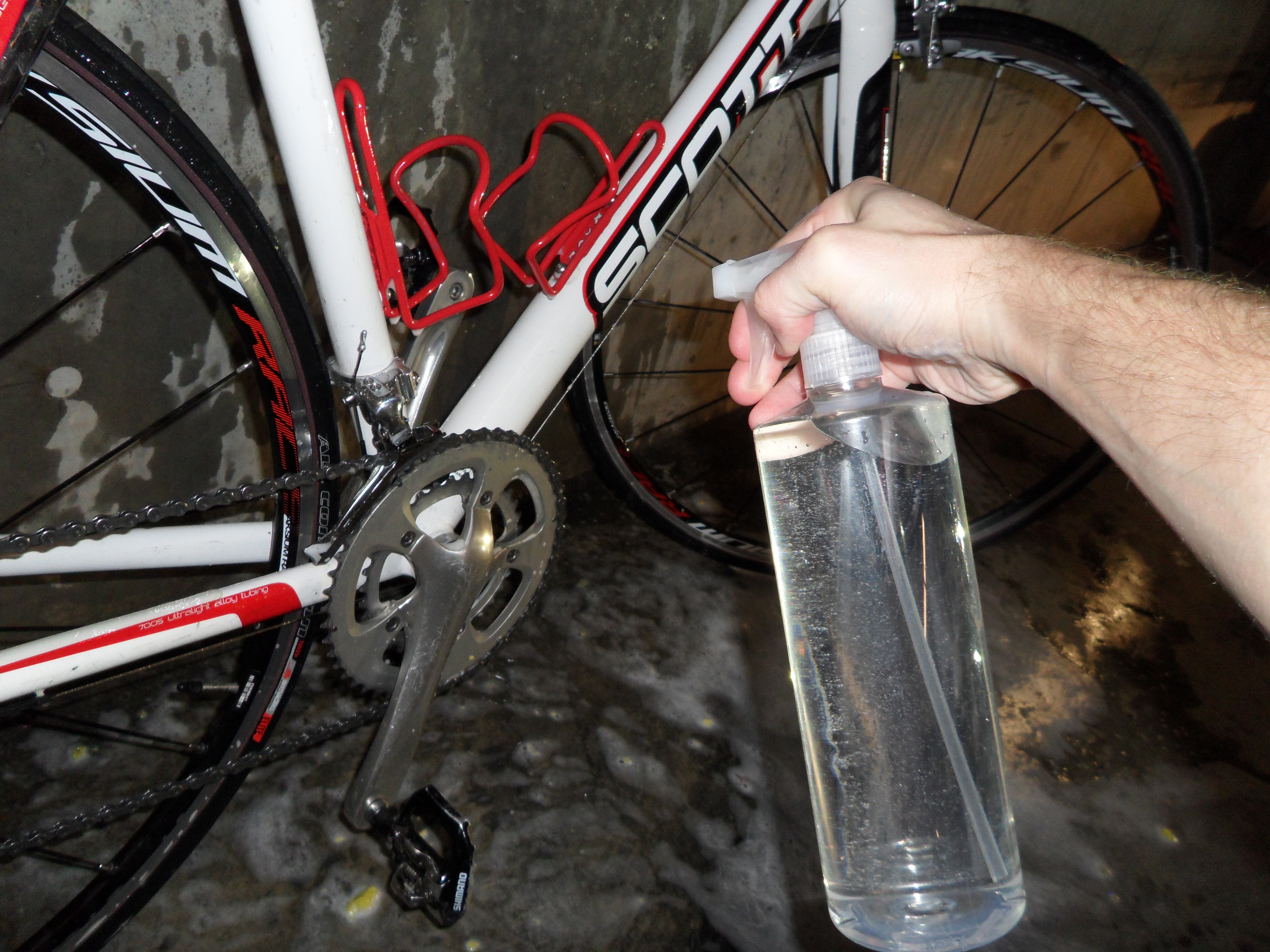 Ring the sponge out over the bike frame one more time to re-wet the bike, then use your spray bottle with clean water to rinse all of the soap off the bike frame and components.