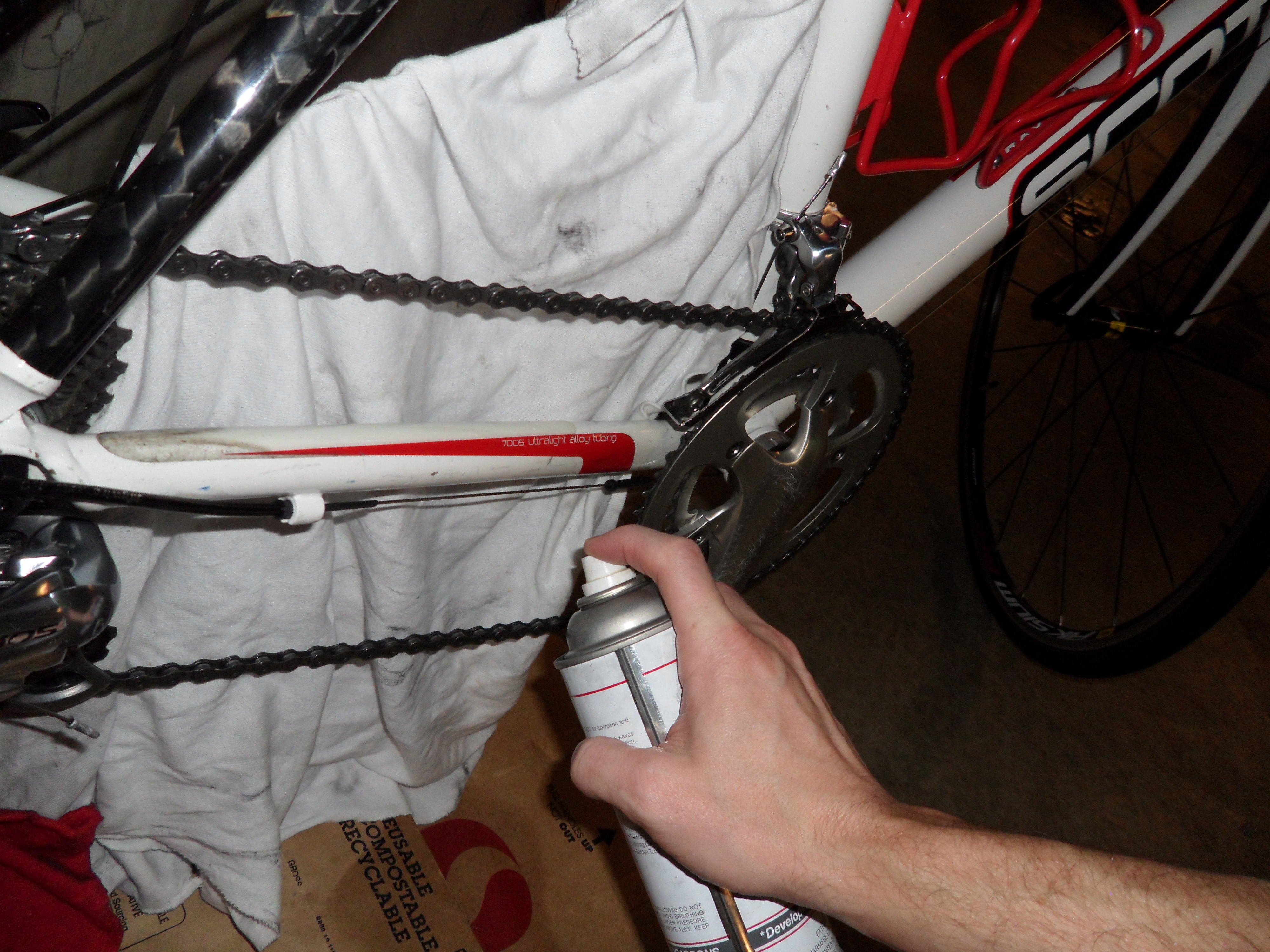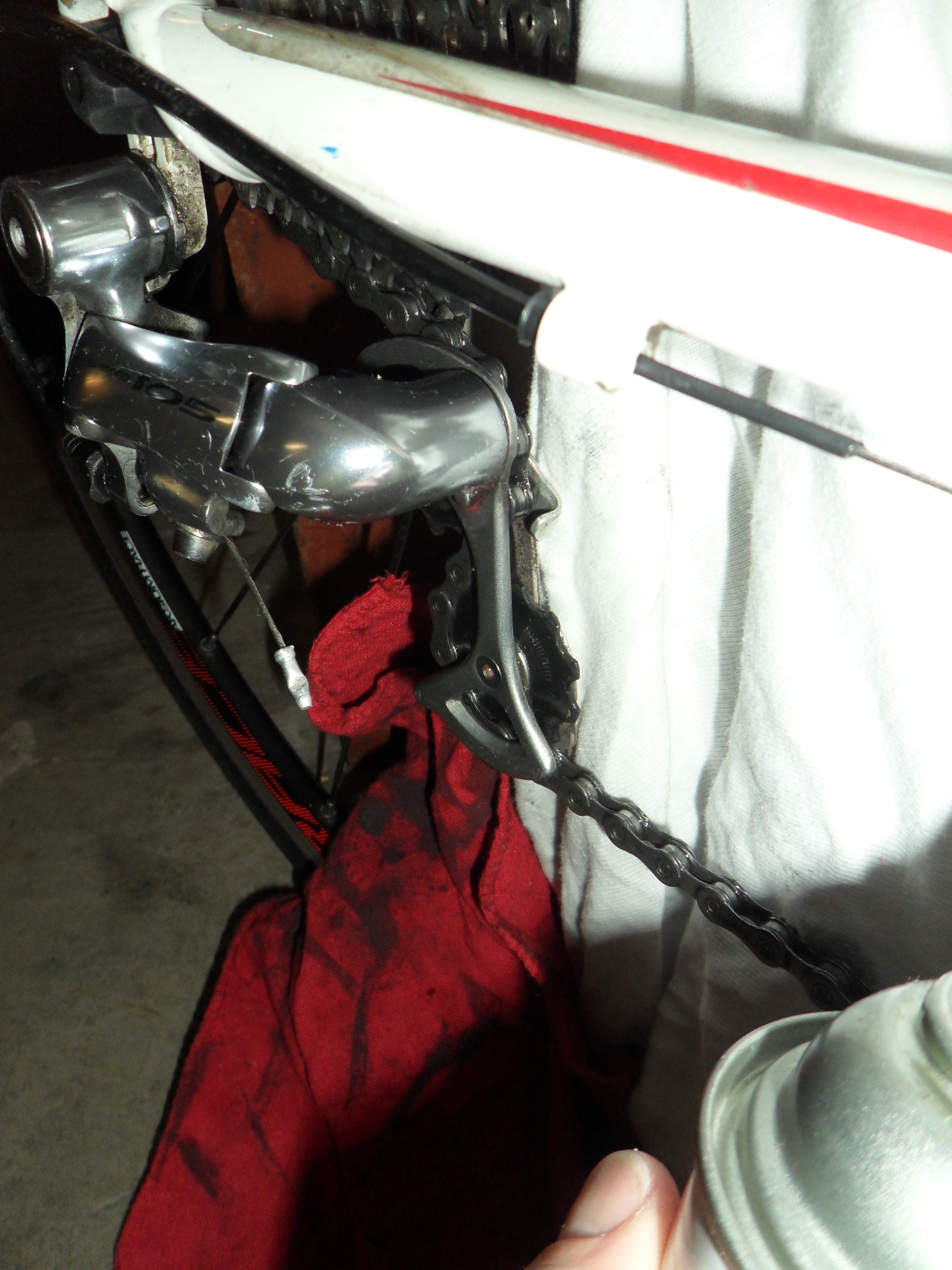Set up the rags behind the the chain and apply the lube to the lower part of the chain behind the chain ring. Rotate the pedals ten times while applying the lube. Next apply the lube to both upper and lower rear derailleur sprockets. Then rotate the pedals another ten times.