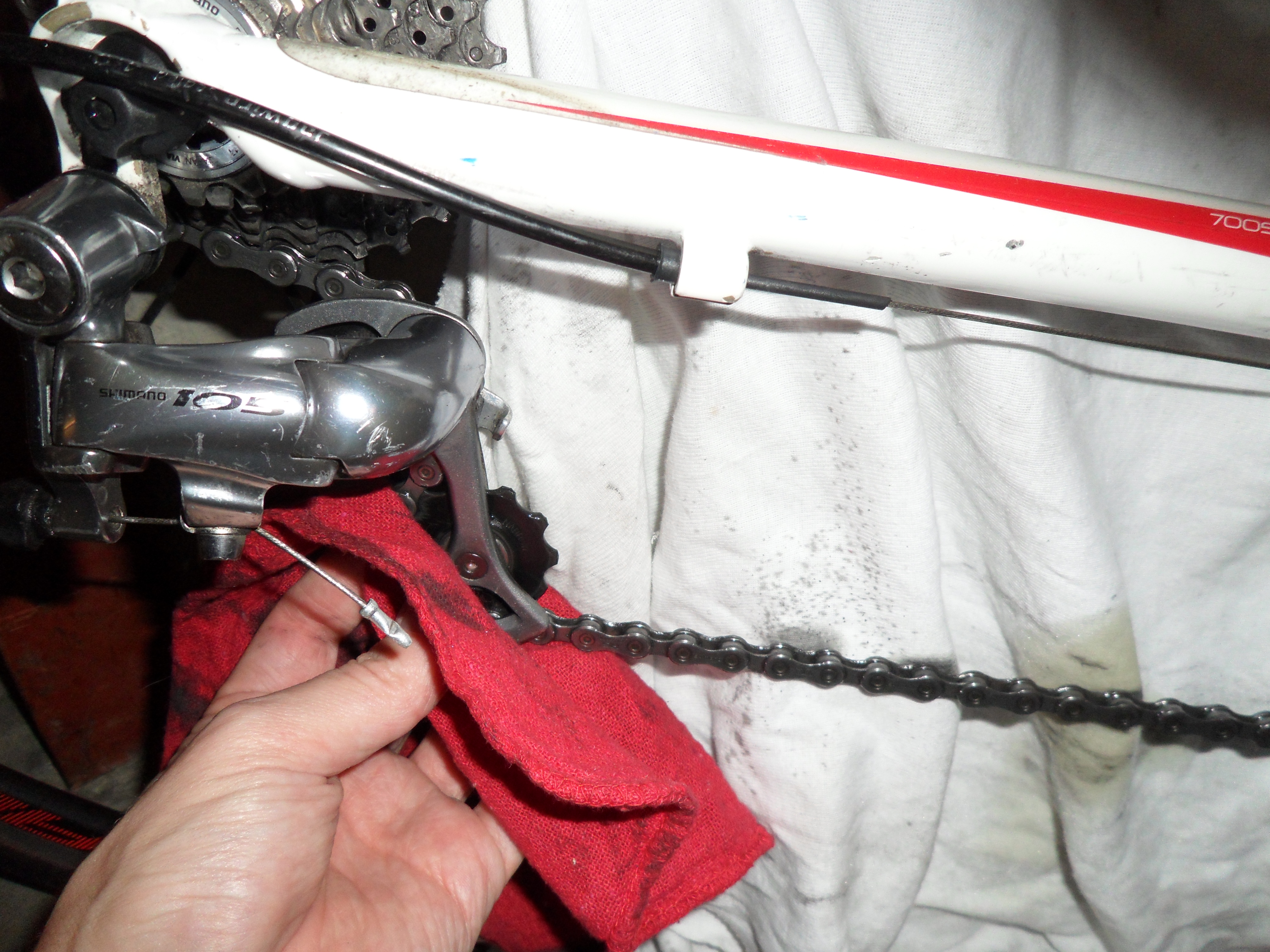 Then place the rag on the chain where it meets the lower sprocket at the rear derailleur and rotate the pedals ten times to remove excess lube. Repeat at the upper sprocket.
