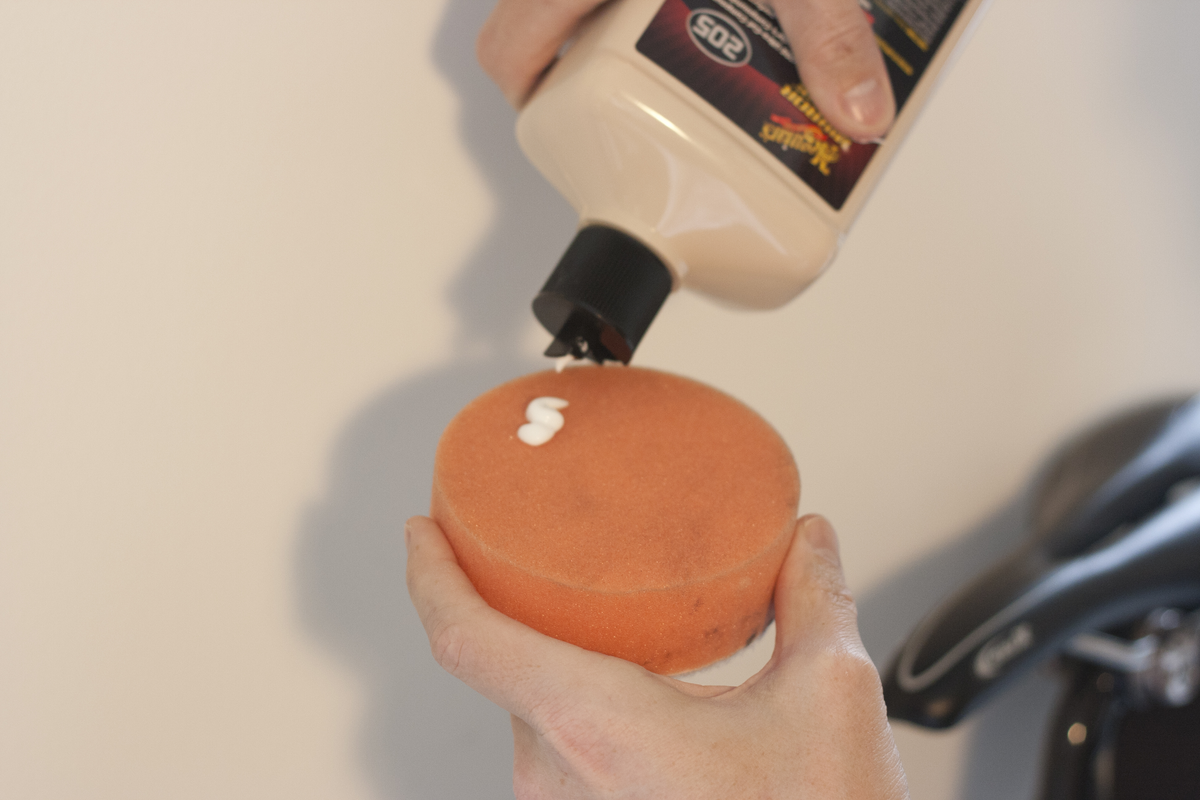Next, apply the Meguiar’s M205 polish to the polishing pad. Dab a small amount of polish onto the various parts of the frame. Then use the pad to work the polish onto the entire frame. Use a circular motion to work the polish in. The polish is fully applied once you no longer see any obtuse coating or streaking from the application. The finish will feel a bit rough and waxy to the touch.