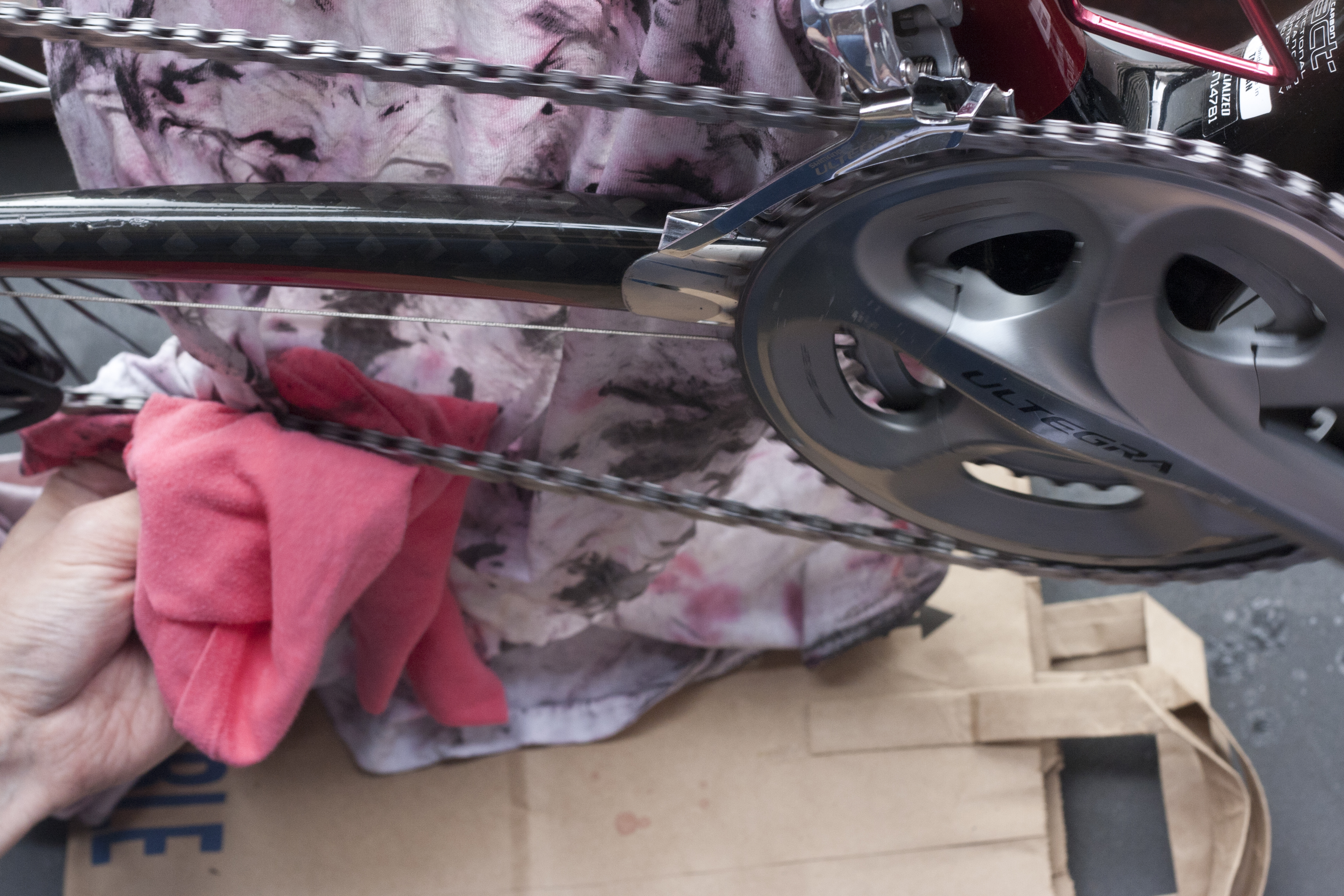 Now lightly press the outside and inside of the chain with the rag between your fingers. Rotate the pedals thirty times to remove the excess lube.