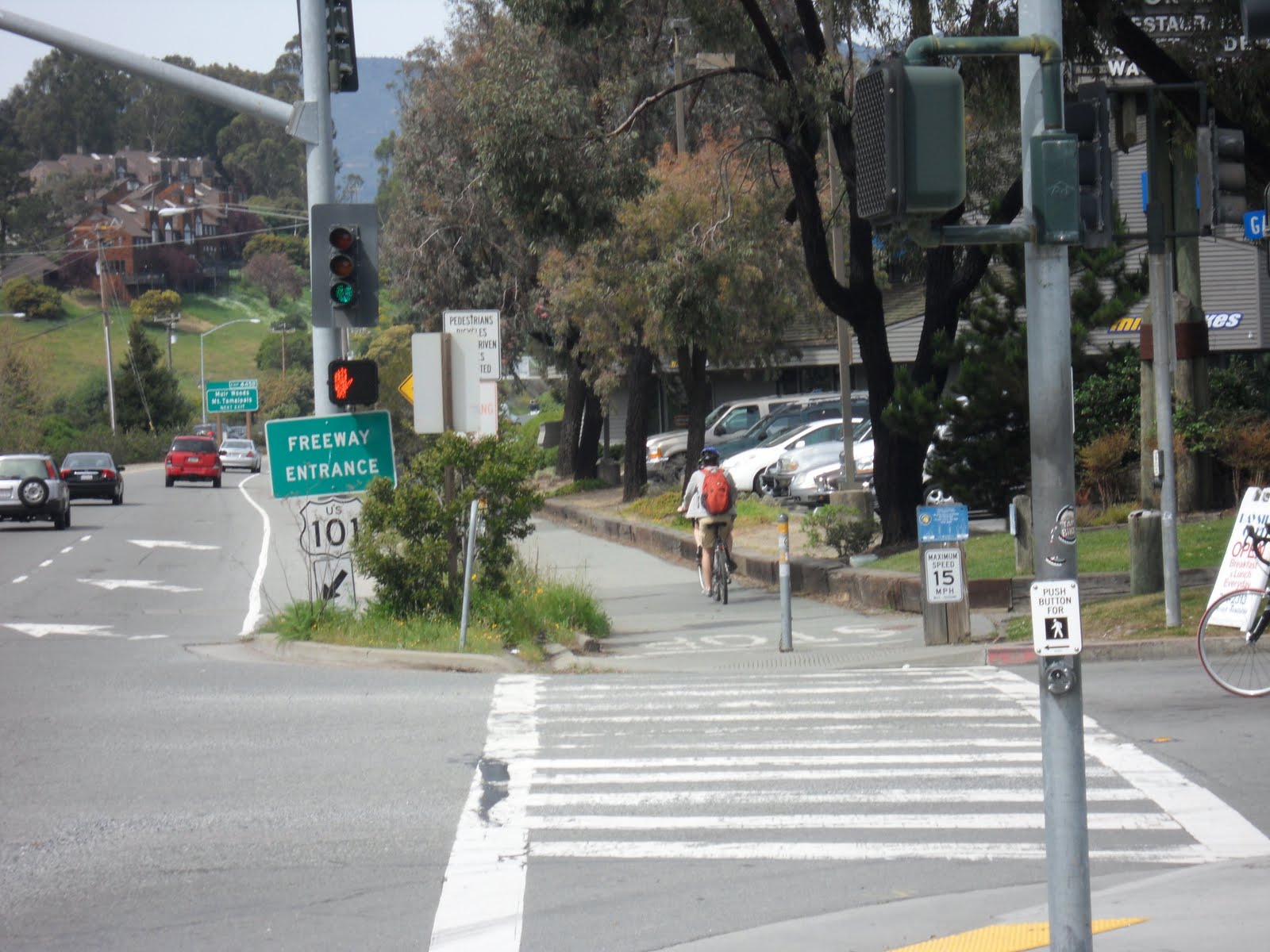 At the stop sign with Cascade Drive and Frustuck Avenue, follow Bolinas Road toward the left and towards Mt. Tam and Alpine Dam.