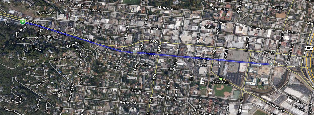 At this point you have two options for going through San Rafael. The shorter, more direct route is to merge with 2nd Street and follow along 2nd Street all the way to Lincoln Avenue.
