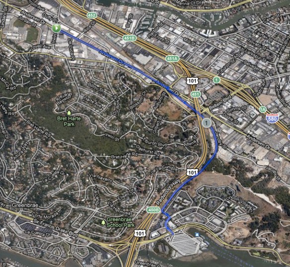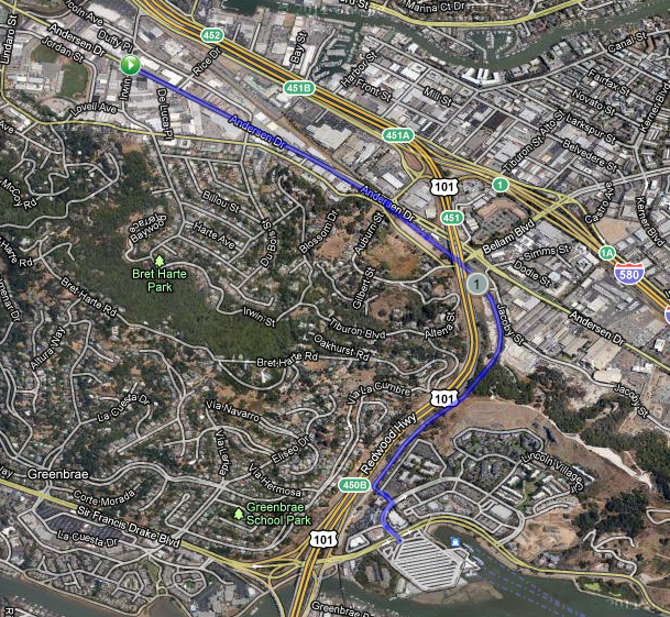Follow Andersen Drive through lower San Rafael until you reach the bike path entrance just before the intersection with Francisco Boulevard.