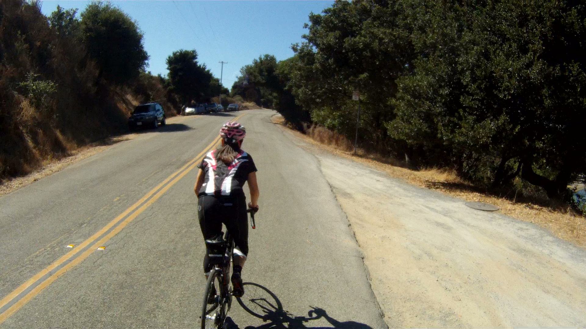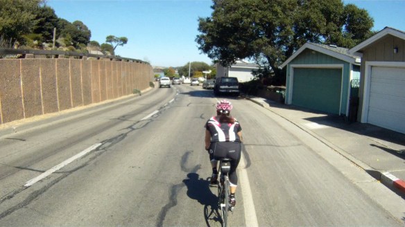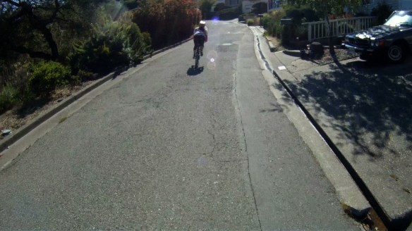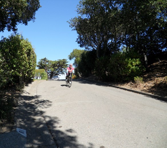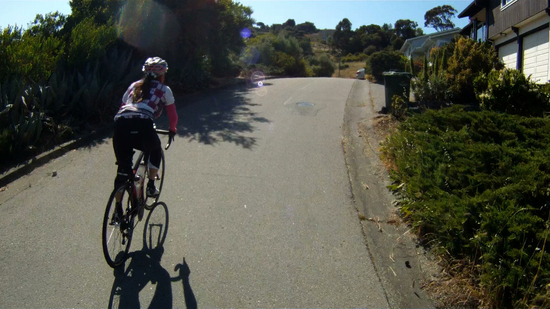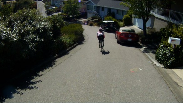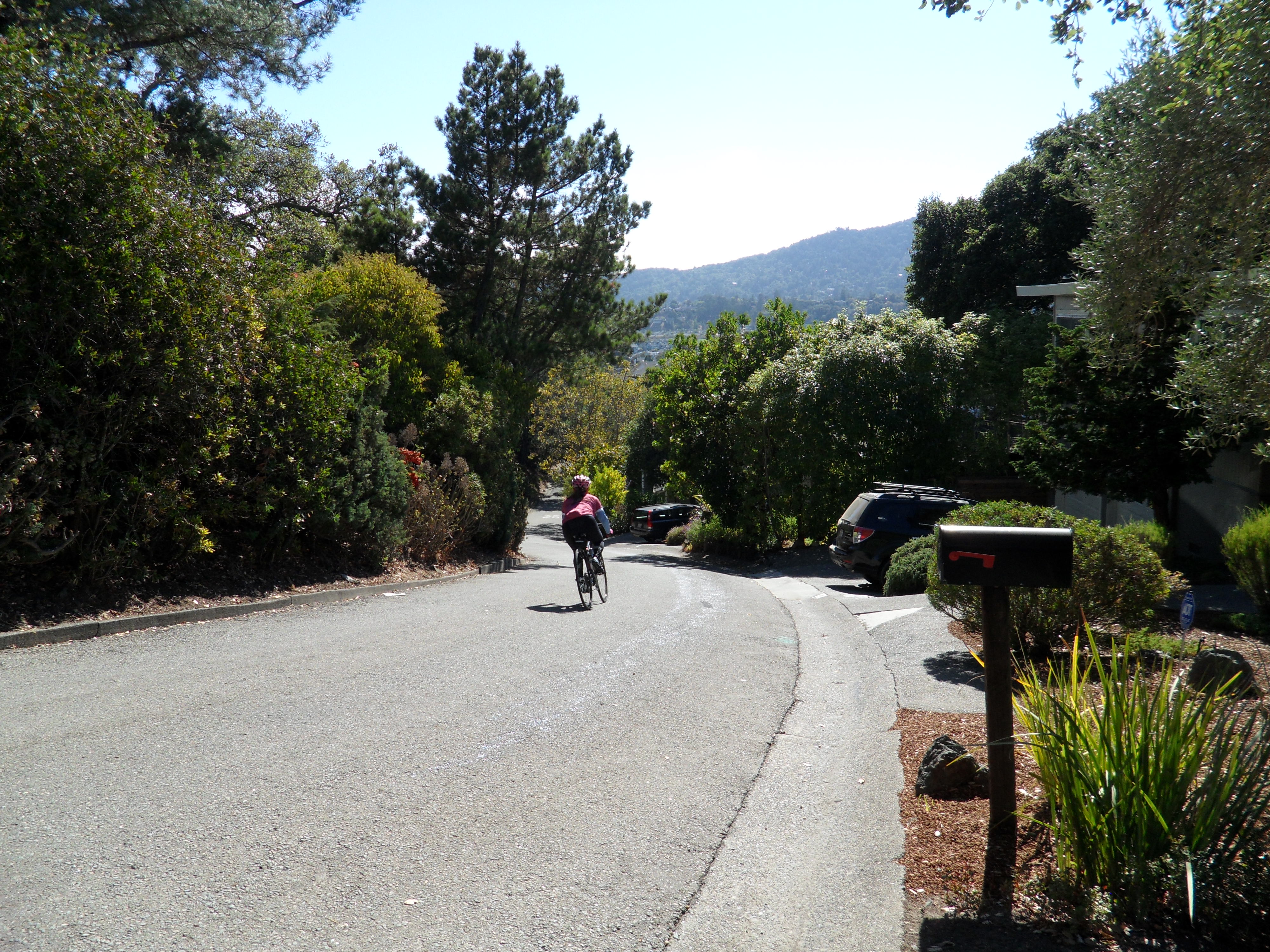 This narrow residential road has cars parked and driveways to your right, stay in control and watch for cars as you descend the next hill which will roll into another steep climb.