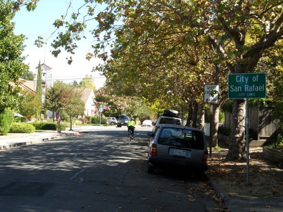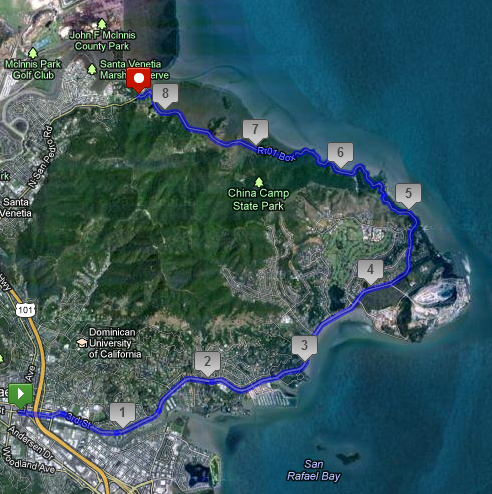 San Rafael is the gateway to China Camp and a great way to return to the Larkspur Ferry from Fairfax or San Anselmo. San Rafael is not for the faint of heart! The high traffic environment along 2nd Street requires superb bike handling skills and nerve as there are no bike lanes and the drivers see you as an intruder with no right to the road. If you are not ready for the intense traffic, a slower alternate route through San Rafael is also available.