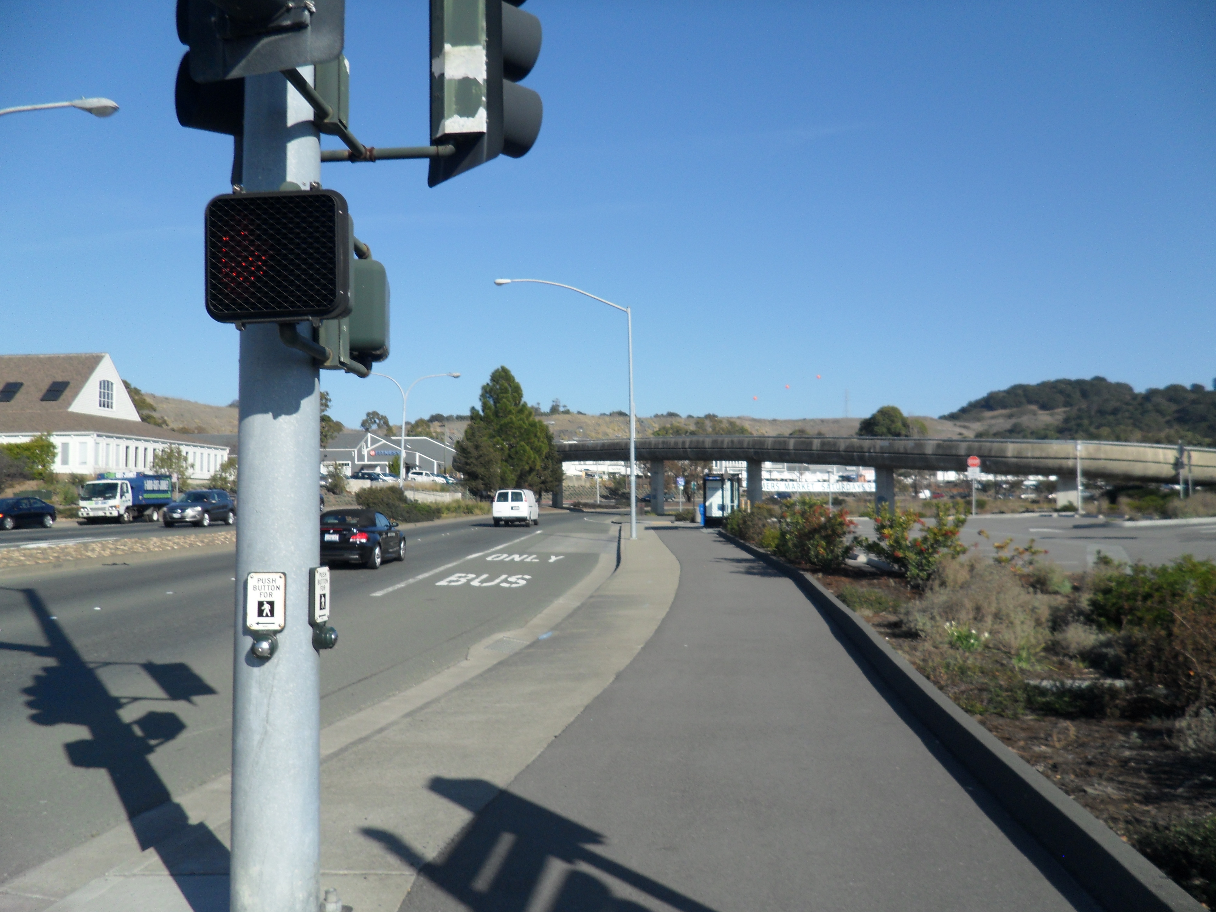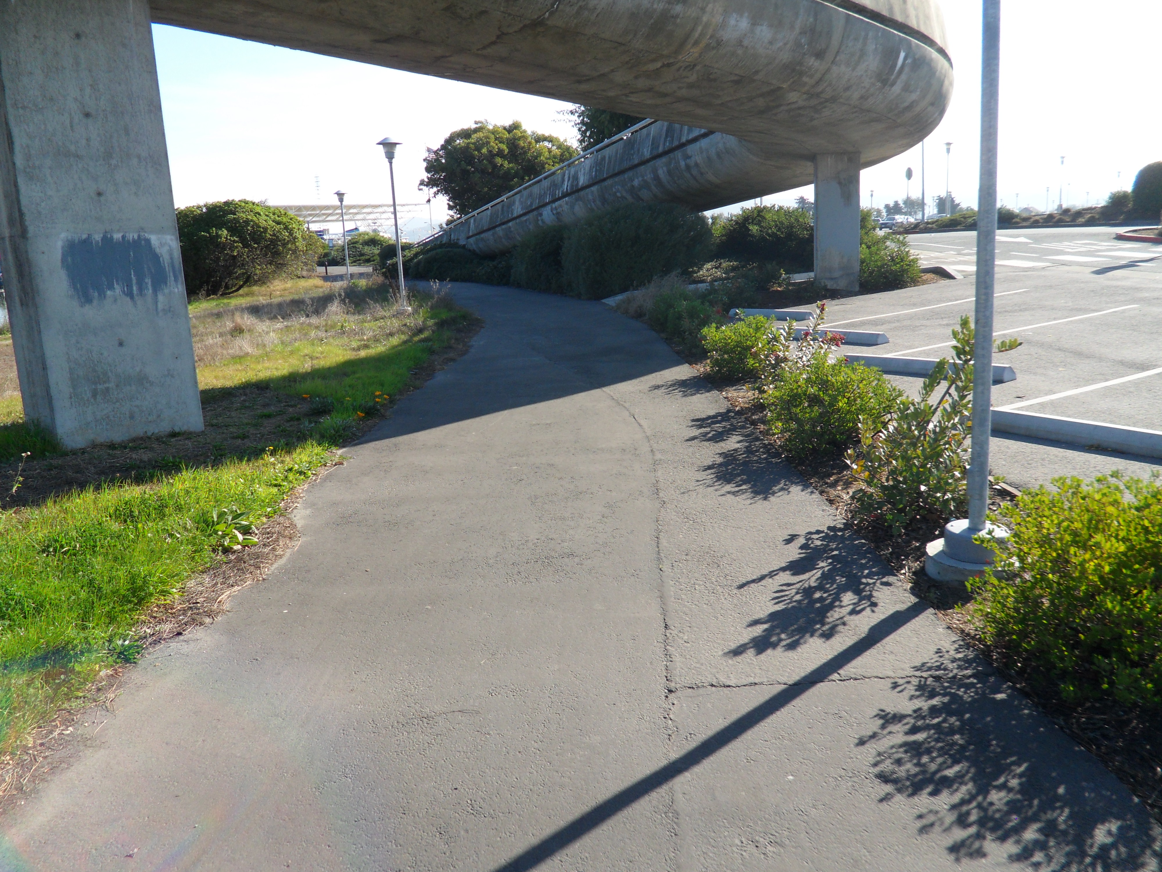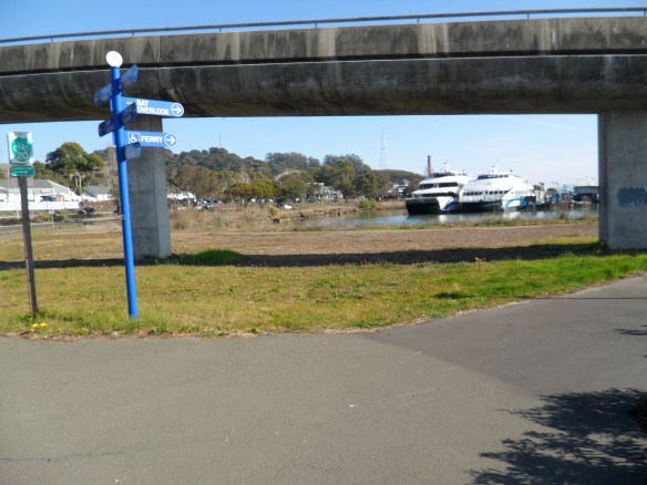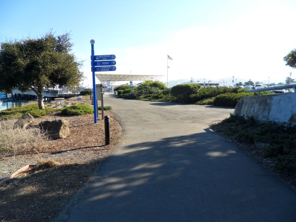 From the stoplight at the Ferry Terminal entrance, follow the path under the pedestrian bridge and then make a quick right.