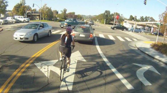 Go through the light at the bottom of he hill and stay towards the center of the lane at the next light staying in the bike lane.