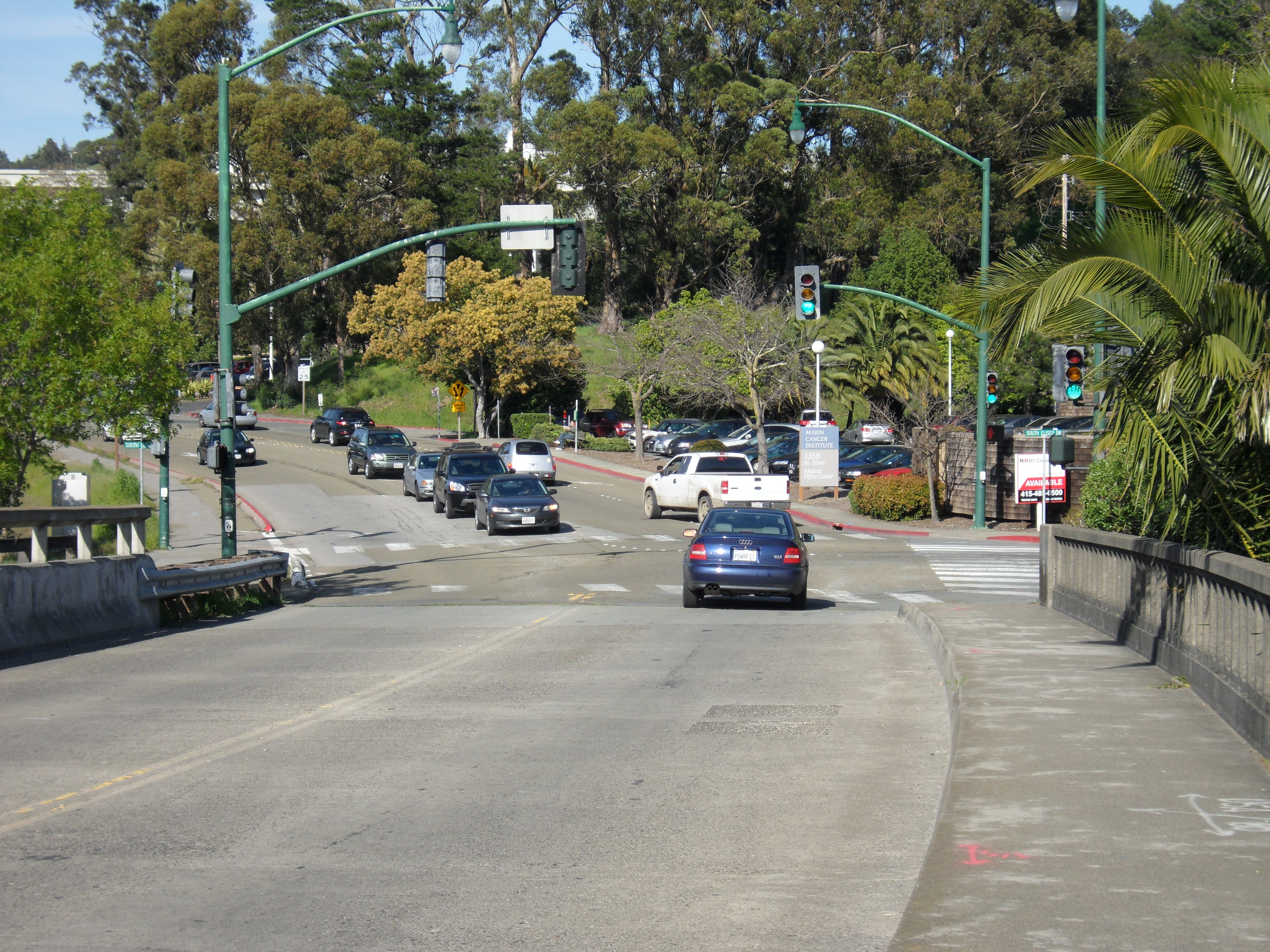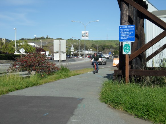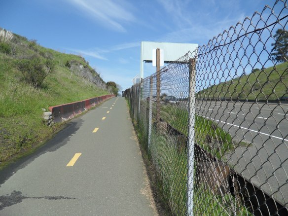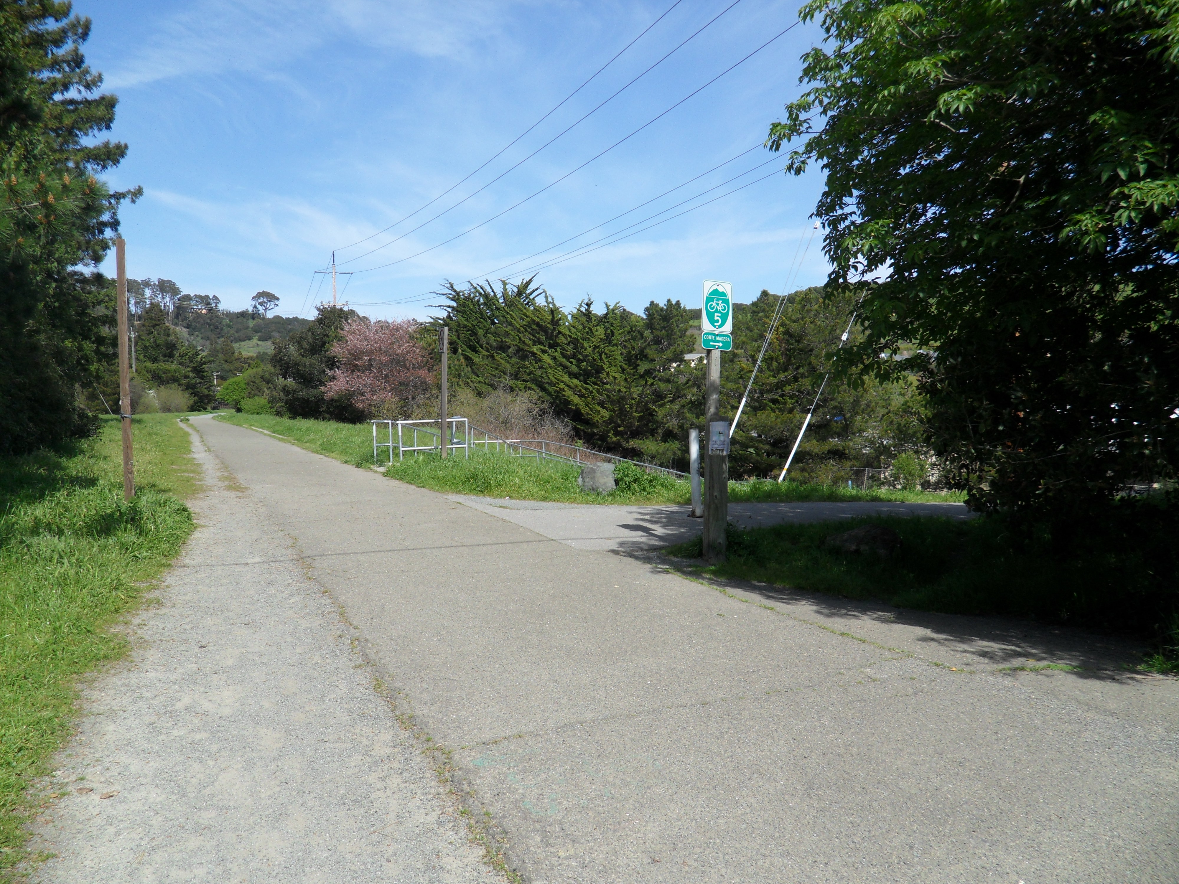Lomita Drive turns left up a hill to the path that follows along US-101.