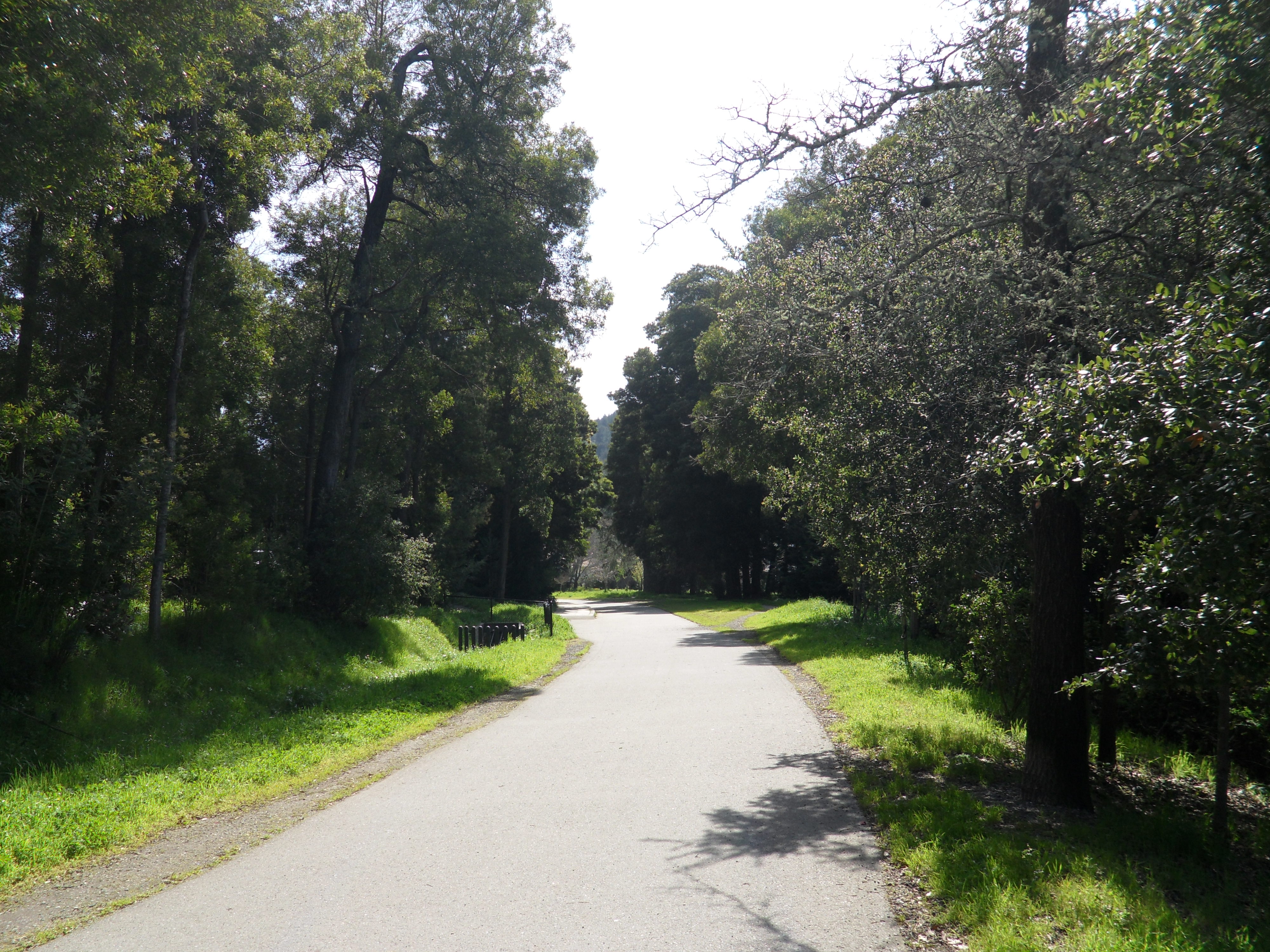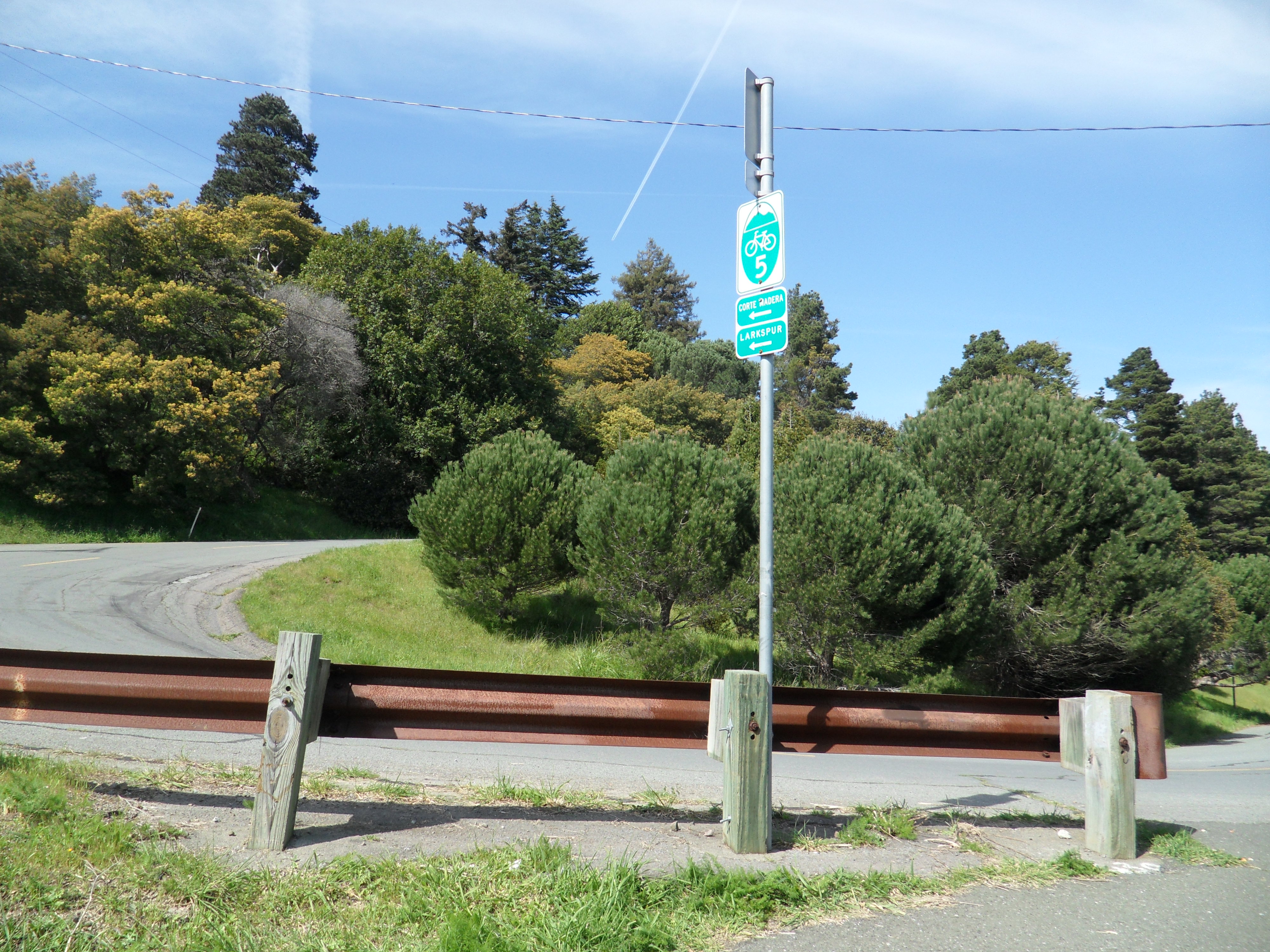 At the light, cross East Blithedale Ave. and continue down the path along Route 5 until you reach the the first paved intersection, and make a right and continue to follow Route 5 down the path.