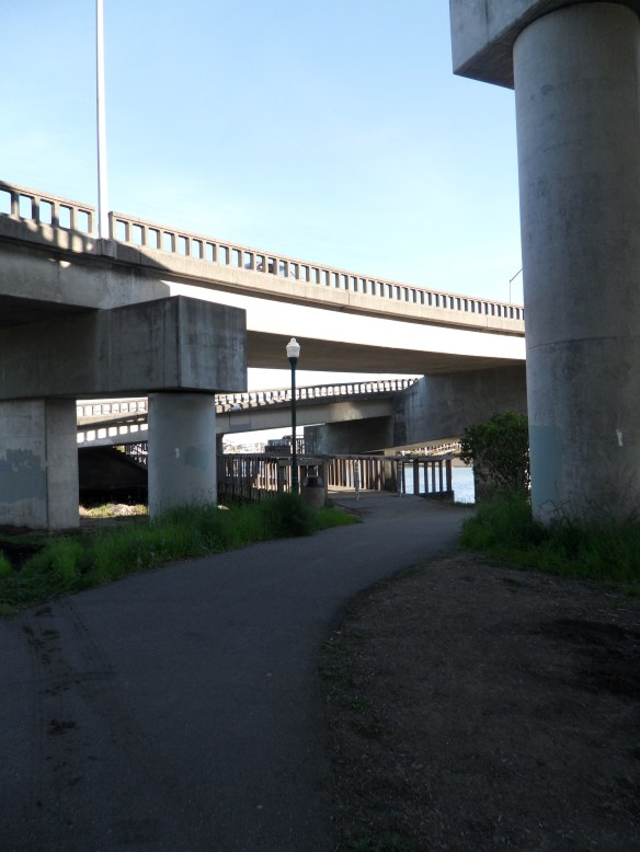 An alternate to the Route 16 bike path is to take the path to the right after the bridge, Route 18, and follow Lucky Drive to the bridge over the channel as seen in
