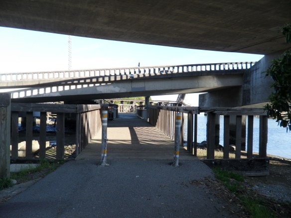 Keep following Route 20 toward the Larkspur Ferry as it winds under the overpass and over the wooden bridge.