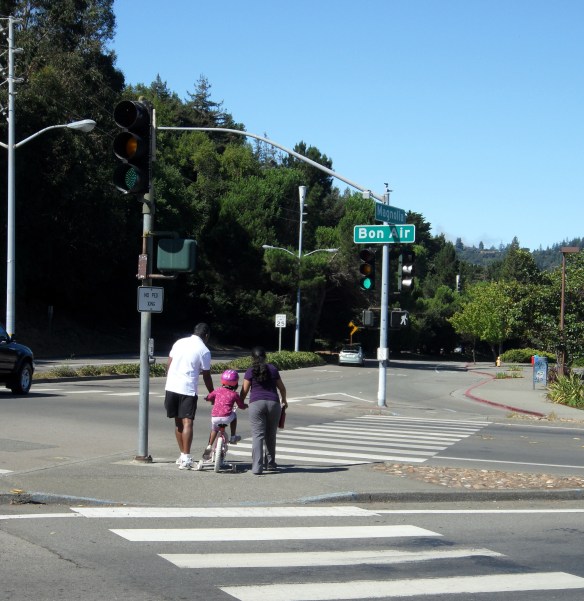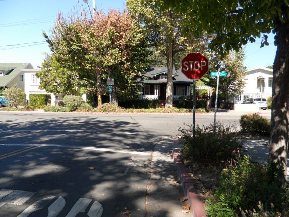 Just before Womum Drive, merge onto the sidewalk to cross Madera Boulevard at the crosswalk.