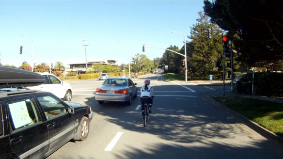 Poised in the standing position, Kelton overtakes a slower mountain biker during a brief break in the traffic.