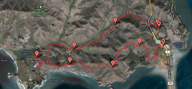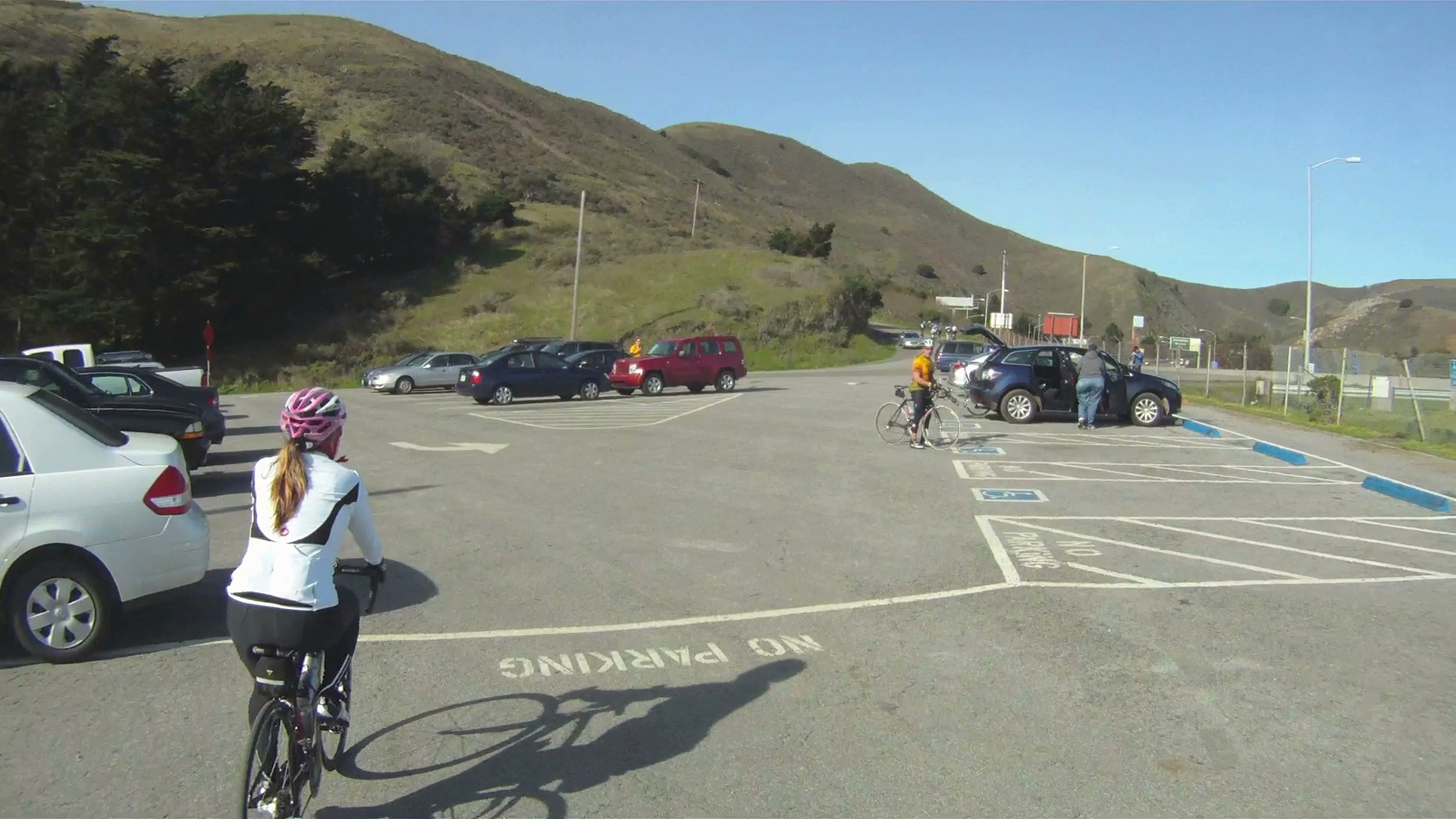 This route starts in the parking lot on the northwest side of the Golden Gate Bridge. This is at the end of the bike side of the Bridge.