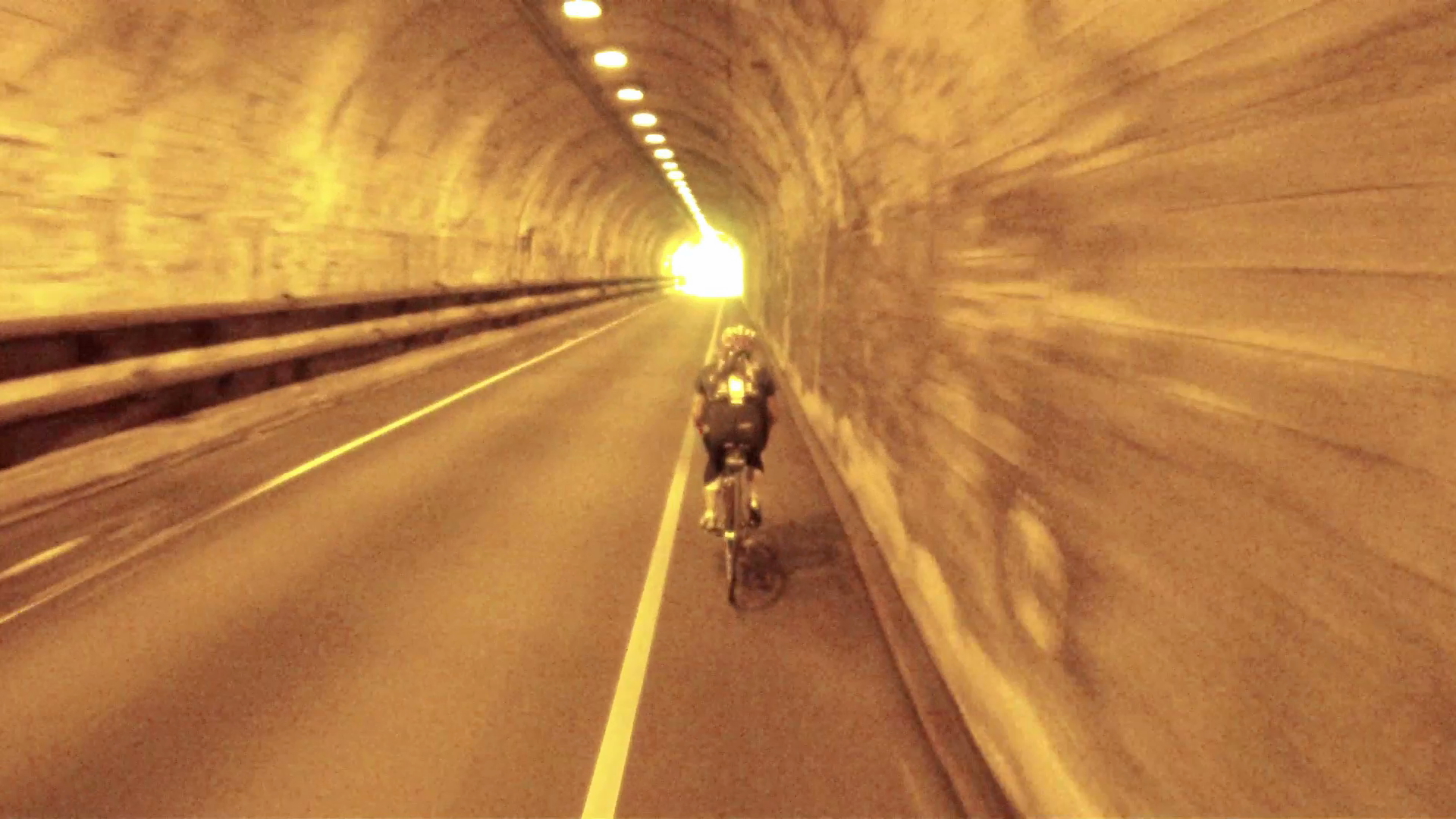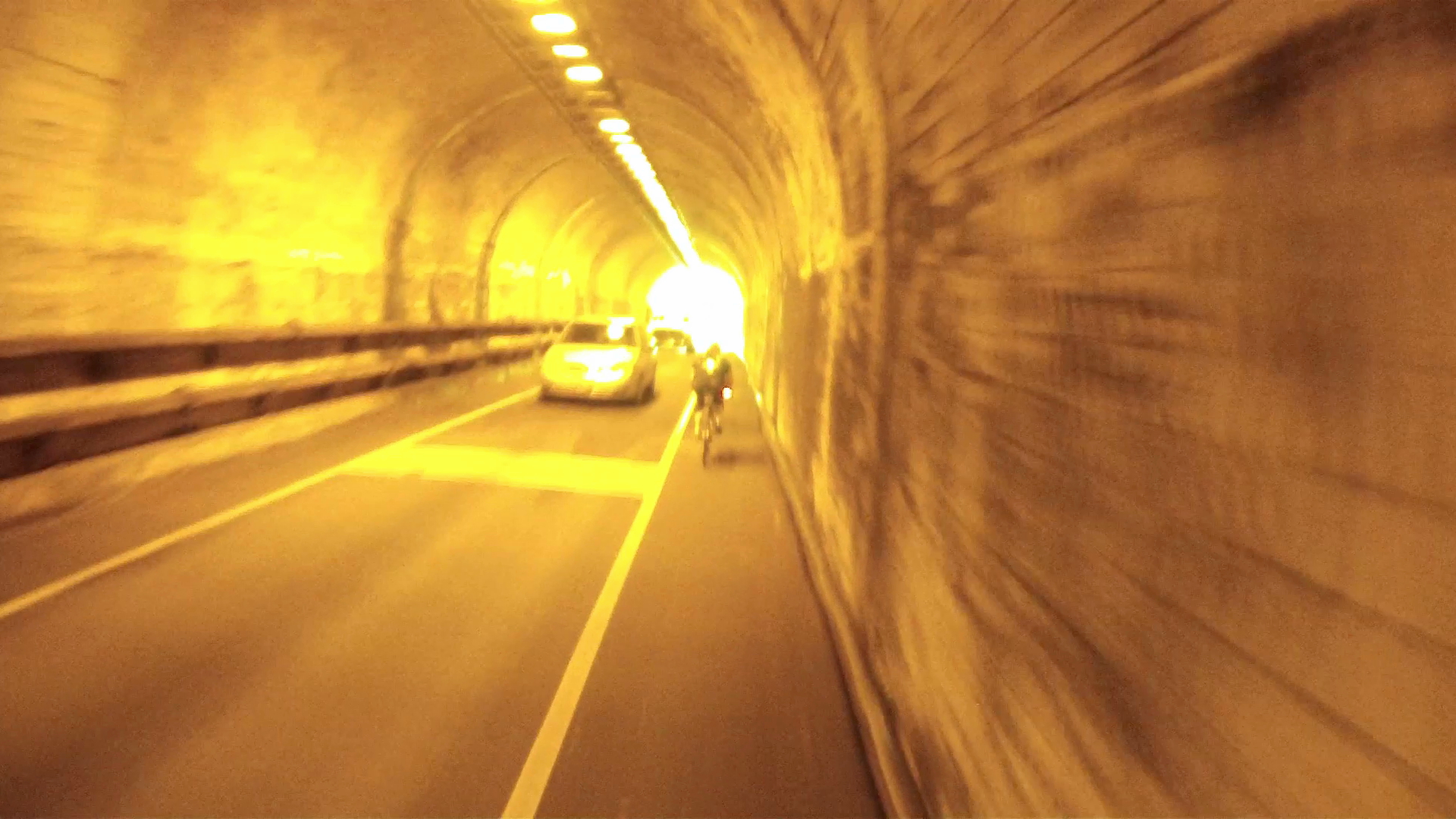 At the beginning of the tunnel there is a button to signal to the on-coming cars a biker is in the tunnel.
