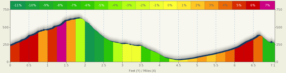 “Hill” is an understatement, but the 18% grade is dead on! You build up speed quickly and two of the first three turns are 90+ degrees! Keep your descending class rules in mind: stay in the drops; just touch your brakes to regulate your speed, don’t hold them; inside knee up to pull your body into the turn; and always keep your eyes up and looking where you want to go because that’s where the bike is going to take you!